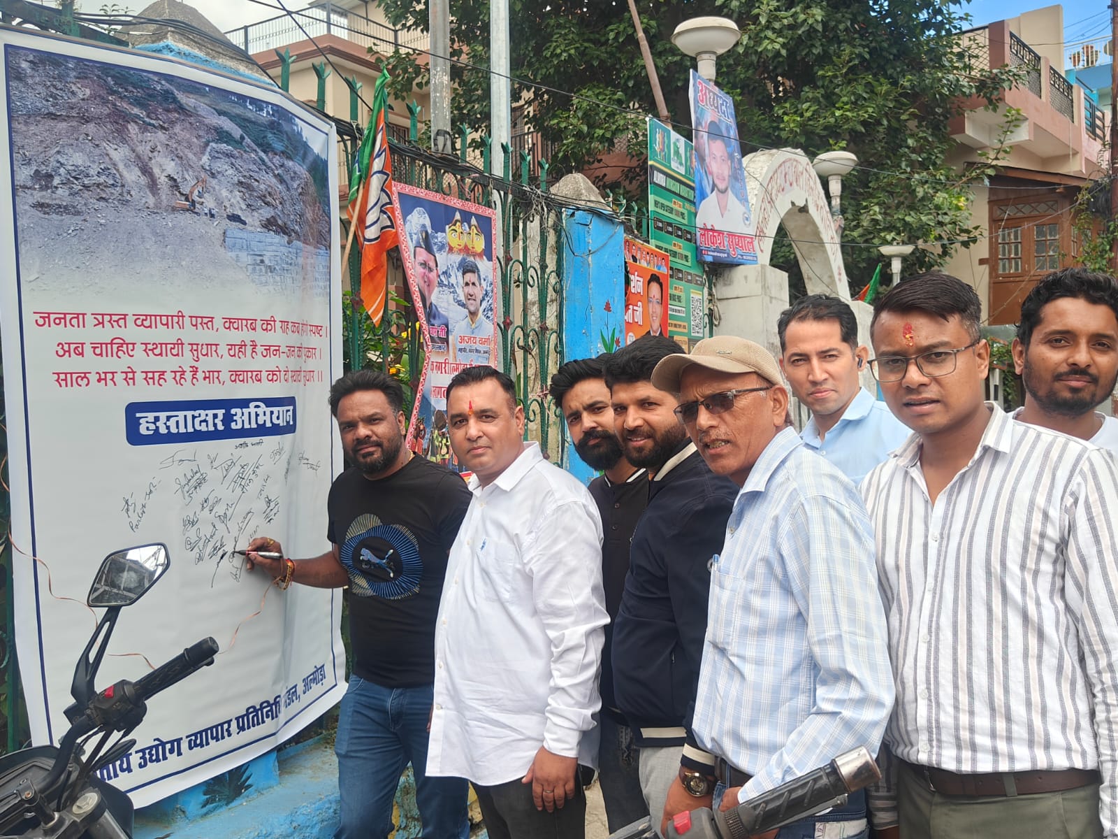 अल्मोड़ा-आज दिनांक 13 सितम्बर को धारानौला और चौघानपाटा में क्वारब मार्ग को 24 घंटे सभी वाहनों के लिए खोले जाने को लेकर हस्ताक्षर अभियान चलाया गया जिसमें अलग अलग क्षेत्रों के व्यापारियों ने हस्ताक्षर कर अभियान को समर्थन दिया है। हस्ताक्षर अभियान में जिलाध्यक्ष सुशील साह,जिला महामंत्री भैरव गोस्वामी,पूर्व पालिका अध्यक्ष शोभा जोशी, पूर्व दर्जामंत्री पूरन रौतेला, किशनलाल,जिला मंत्री आशु गोस्वामी,सहसचिव आशीष भारती, पार्षद अनूप कुमार,पंचायत सदस्य जमन सिंह,परितोष जोशी,दर्शन कुमार,दीपक कुमार,दीपक साह,पूर्व अधीक्षण अभियंता साहबुद्दीन आदि उपस्थित रहे।