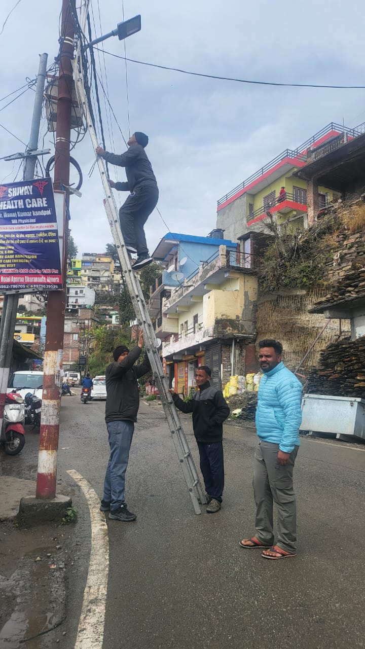 अल्मोड़ा-वार्ड की पथ प्रकाश व्यवस्था को दुरुस्त करने के लिए पार्षद अनूप भारती नगर निगम कर्मचारियों के साथ स्वयं निरीक्षण करने पहुंचे एवं खराब पड़ी स्ट्रीट लाइटों को दुरुस्त करवाने का काम किया। इसके साथ ही पार्षद द्वारा ऐसे स्थानों को चिन्हित किया गया जहां पर स्ट्रीट लाइट की आवश्यकता है। साथ ही साथ बाड़ीबगीचा एवं भ्यारखोला में प्रत्येक स्ट्रीट लाइट को चेक किया गया एवं खराब पड़ी स्ट्रीट लाइटों को दुरुस्त करवाने का कार्य किया गया। इस अवसर पर पार्षद अनूप भारती ने कहा कि रात्रि के समय लोगों का आवागमन सुगम हो इसके लिए उनके द्वारा पूरे वार्ड में पथ प्रकाश की व्यवस्था को दुरुस्त करवाया जा रहा है।उन्होंने कहा कि ऐसी जगहों को भी उनके द्वारा चिन्हित किया गया है जहां पर पथ प्रकाश की आवश्यकता है।भविष्य में इन स्थानों पर भी पथ प्रकाश की व्यवस्था सुनिश्चित कराई जाएगी।