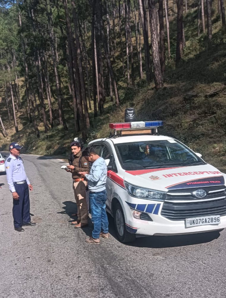 अल्मोड़ा-देवेन्द्र पींचा वरिष्ठ पुलिस अधीक्षक अल्मोड़ा द्वारा सड़क दुर्घटनाओं की रोकथाम व यातायात नियमों का उल्लंघन करने वाले वाहन चालकों पर चालानी कार्यवाही किये जाने के सम्बन्ध में यातायात पुलिस अधिकारियों को सख्त निर्देश दिए गये है।दिनांक 5.11.2024 को सीओ यातायात विमल प्रसाद के पर्यवेक्षण मे इंटरसैप्टर प्रभारी सुमित पाण्डे द्वारा मय हमराही हेड कानि सुनील कुमार, कानि ललित बिष्ट के अल्मोड़ा नगर क्षेत्र लोधिया में वाहन चेकिंग अभियान चलाया गया।जिस क्रम में चेकिंग के दौरान वाहन संख्या UK05-CA-0687 ट्रक चालक प्रकाश चन्द्र आर्या निवासी खैड़ा हल्द्वानी शराब के नशे में वाहन चलाते हुए पाया गया। चालक को मोटरवाहन अधिनियम के तहत गिरफ्तार कर वाहन को सीज किया गया।वाहन संख्या- UK04-TB-3460 ऑल्टो चालक वाहन को बिना फिटनेस,बिना डीएल व बिना आरसी के चलाता पाया गया।जिसके विरुद्ध मोटर वाहन अधिनियम के तहत कार्यवाही कर वाहन को सीज किया गया।वाहन में सवार यात्रियों को अन्य वाहनों से उनके गंतव्य हेतु रवाना किया गया।
