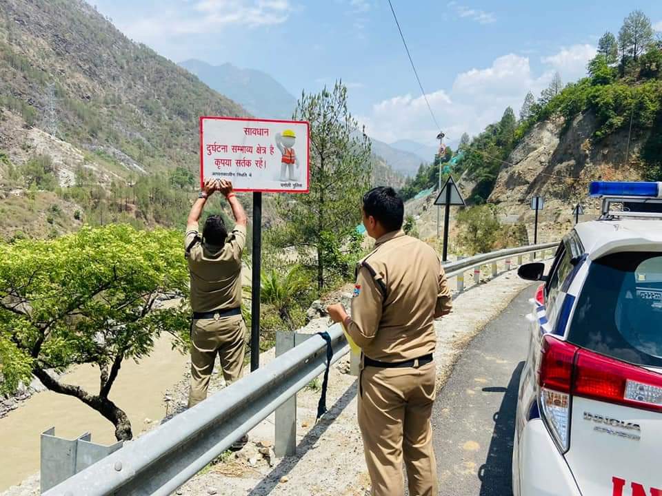चमोली-उत्तराखंड में चारधाम यात्रा का आरम्भ हो चुका है,दिनांक 8.5.2022 को बद्रीनाथ धाम के भी कपाट खुल जाएंगे।बड़ी संख्या में पर्यटकों के आगमन के साथ ही सुरक्षित और निर्वाध यातायात व्यवस्था पुलिस के लिए कर्तव्य निर्वहन के साथ ही एक बड़ी चुनोती भी रहती है।जिस क्रम में जनपद चमोली यातायात पुलिस लगातार अपनी तैयारियां में जुटी है।दिनांक 5.5.2022 को श्रीमती श्वेता चौबे पुलिस अधीक्षक चमोली के निर्देशन में यातायात पुलिस द्वारा यात्रा मार्ग में अनेक स्थानों पर रेट्रो रिफ्लेक्टर साइन बोर्ड लगाए गए।रेट्रो रिफ्लेक्टर बोर्ड लगाने का मुख्य उद्देश्य रात्रि में चलने वाले वाहनों को दुर्घटना सम्भाव्य क्षेत्र,मार्ग संकरा होने की जानकारी के साथ ही यातायात सांकेतिक और आदेशात्मक जानकारी प्रदान करना है।ज्ञातव्य हो कि वर्तमान में चारधाम यात्रा के दौरान प्रातः 4 बजे से रात्रि 10 बजे तक वाहन मार्ग पर संचालित हो सकेंगे।श्रद्धालुओं की यात्रा को सुरक्षित और सुगम बनाने की दिशा में यातायात पुलिस द्वारा यह प्रयास किया गया है।