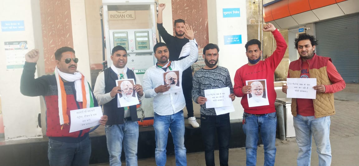 चम्पावत- सूरज प्रहरी जिलाध्यक्ष युवा कांग्रेस के नेतृत्व में यूथ कांंग्रेस कार्यकर्ताओं ने पेट्रोल पंप पर बढ़ते डीजल पेट्रोल के दामों को लेकर प्रदर्शन कर नरेंद्र मोदी के फोटो पर कालिख पोत आक्रोश व्यक्त किया तथा भाजपा सरकार के कार्यकाल को निराशाजनक करार दिया।जिलाध्यक्ष प्रहरी ने बढ़ती महंगाई को लेकर भाजपा सरकार के साथ मोदी सरकार को फेल बताया।युवा कांग्रेस जिलाध्यक्ष प्रहरी ने कहा कि अंतर्राष्ट्रीय स्तर पर कच्चे तेल की कीमतों में प्रति बैरलों में गिरावट है तो देश में पेट्रोल डीजल के दामों में दिन प्रतिदिन बढ़ोत्तरी क्यों की जा रही है।देश मे आसमान छूती पेट्रोल,डीजल के दामो में तिगुनी वृद्धि क्यों की जा रही है।उन्होंने कहा कि कच्चे तेल की कीमत कम होने के बावजूद भी मोदी सरकार आये दिन तेल के दाम बड़ा रही है जो कि आम जनता के साथ खुलेआम लूट है।उन्होंने कहा कि आम आदमी की जेब लूटी जा रहीं हैं।उन्होंने जल्द से जल्द मोदी सरकार को पेट्रोल डीजल के दाम कम करने की चेतावनी दी।उन्होंने कहा कि यूपीए सरकार में जिन्हें महंगाई डायन लगती थी आज वही लोग महंगाई को विकास समझ बैठे है।उन्होंने कहा कि भाजपा सरकार महंगाई के जरिये पूजीपतियों को फायदा पहुंचा कर चुनावी फंड जुटा रही है।राज्य एवं केंद्र सरकार के अहंकार का घड़ा अब भर चुका है।अब जनता मोदी को 2024 में केंद्र की सरकार से एवं 2022 में राज्यों से उखाड़ फेंकने को तैयार है।प्रदर्शन में विकास साह जिला महामंत्री,युवा कांग्रेस के चिराग फर्त्याल,रोहित बिष्ट सभासद/जिला महामंत्री,दीपक नेगी, मयूख चौधरी,तरूण वर्मा,दान सिंह, सहित दर्जनों कांग्रेस जन उपस्थित रहे।