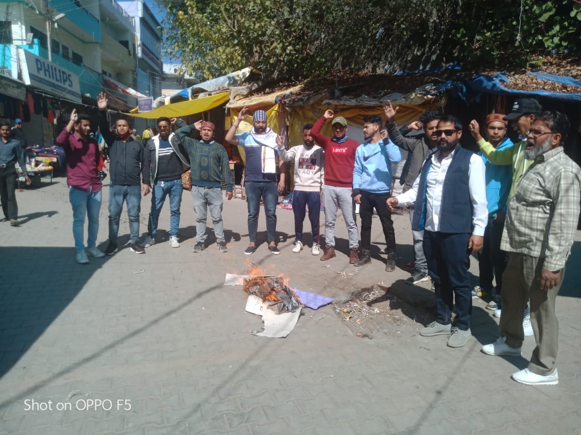 पिथौरागढ़-आज यूथ कांंग्रेस पिथौरागढ़ द्वारा जिलाध्यक्ष ऋषेन्द्र महर के नेतृत्व में गांधी चौक में एकत्रित होकर केन्द्र व प्रदेश की भाजपा सरकार का पुतला दहन किया गया।इस अवसर पर जिलाध्यक्ष ऋषेन्द्र महर ने कहा कि सरकार द्वारा जन शताब्दी रेल टनकपुर से दिल्ली चलाने की गयी जिसे पूर्णागिरि जनशताब्दी नाम दिया गया।लेकिन जब इसका शेड्यूल देखा गया तो पता चला कि पूर्व में इसी समयावधि में चलने व पहुंचने वाली नागलडैम एक्सप्रेस का मात्र नाम बदलकर पहाड़ की भोली भाली जनता को ठगने का काम किया गया है।उन्होंने कहा कि यह पहाड़ की विडम्बना ही है कि डबल इंजन सरकार द्वारा जो जन शताब्दी चलाई गयी है वह दस घन्टे से अधिक समय दिल्ली पहुंचने में ले रही है जबकि काठगोदाम से मात्र पांच घंटे में शताब्दी एक्सप्रेस दिल्ली पहुंचा देती है।प्रदेश सचिव करन सिंह व विधानसभा अध्यक्ष शुभम बिष्ट ने कहा कि पहाड़ के व्यक्ति को भाजपा द्वारा हमेशा ठगा गया है और लगता है कि अब उत्तराखंड की सरकार भी नाम बदलो योजना चला रही है।जिसमें पहाड़ की भोली भाली जनता का अपमान किया गया है जिसे पहाड़ बर्दाश्त नही करेगा।पुतला दहन कार्यक्रम में जिला महासचिव आनन्द धामी,हाजी भूरे मियां,प्रकाश देवली,शिवम पन्त,पारस सिंह,महेन्द्र नाथ,अकुर महर,धीरज कुमार,कपिल बोरा,नवीन भण्डारी,कपिल जोशी,अभिषेक कोहली सहित दर्जनों यूथ कांंग्रेस कार्यकर्ता शामिल रहे।