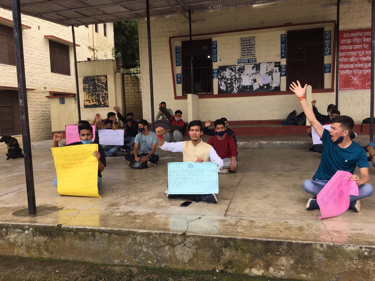 चाहे किसी भी प्रकार की कक्षाएं हो ऑनलाइन या ऑफलाइन कोई भी प्रकार की कक्षाएं नहीं हुई है ऐसे में विश्वविद्यालय प्रशासन बार बार ऑनलाइन कक्षाओं का हवाला देकर इस बात से नहीं मुकर सकता कि पर्वतीय क्षेत्रों में नेटवर्क का अभाव है और इस कारणवश छात्र छात्राओं को काफी कठिनाइयों से गुजरना पड़ रहा है।आर्थिक रूप से कमजोर छात्र छात्राएं कोचिंग का सहारा नहीं ले सकते हैं।जहाँ विश्वविद्यालय प्रशासन की तरफ से ना ही कक्षाएं संपन्न की जा सकी और ना ही किताबों का वितरण हुआ है ऐसे में परीक्षाएं आयोजित करना छात्रों के भविष्य के साथ खिलवाड़ करने जैसा होगा। इसलिए सम सेमेस्टरों के छात्रों को पिछली सेमेस्टर के अंकों के आधार पर व असाइन्मेन्ट के आधार पर प्रोन्नत किया जाए।साथ ही छात्र नेता ऋषभ भाकुनी द्वारा कहा किया कि न जाने बी०एस०सी /बी०काम० के कितने ही छात्र छात्राओं को शून्य अंक दिए है जिससे उनका मनोबल टूटा हुआ है।ऐसी लापरवाही की उम्मीद विश्वविद्यालय से हम नहीं रखते हम उनकी उत्तरपुस्तिका की पुनः जांच की मांग करते हैं।साथ ही युवा आह्वान के जिला उपाध्यक्ष मोहित बिष्ट द्वारा कहा गया कि बी०एस०सी०/बी०काम० के परीक्षाफलों में हुई गड़बड़ी काफी चौका देने वाली है।परीक्षाफलों में गड़बड़ी एक नया ट्रेंड सा बन गया है।साथ ही छात्र नेता योगेश उप्रेती द्वारा कहा गया कि छात्र छात्राओं को इस बार काफी असमंजस की स्थिति का सामना करना पड़ रहा है।यू०जी०सी० की गाइडलाइन्स के आधार पर विश्वविद्यालय को आगे के कदम लेने चाहिए।लेकिन विश्वविद्यालय प्रशासन अपनी मनमानी करते हुए परीक्षाएं आयोजित करा रहा है।जो कि छात्रों के भविष्य के साथ खिलवाड़ है।धरना देने वालों में गौरव भंडारी,योगेश उप्रेती, मोहित बिष्ट,चिराग जोशी,विशाल बिष्ट,विनय कपकोटी,संदीप नेगी, अर्जुन बिष्ट,सुमित कुमार,रोहित कांडपाल,सौरभ राज,आयुष डसीला, पवन पांडे,हिमांशु नेगी,भाष्कर गोस्वामी,भुवन भंडारी,नीरज चिलवाल,ऋषभ भाकुनी,विकास बोरा, वरुण बोरा,दीपक तिवारी,गोकुल बोरा, सुरेश पांडे,पंकज जोशी,मोहित पंत, जगदीश जोशी,कमल पंत,पंकज कुमार,सौरभ बिष्ट,सुरेश नेगी आदि छात्र मौजूद रहे।