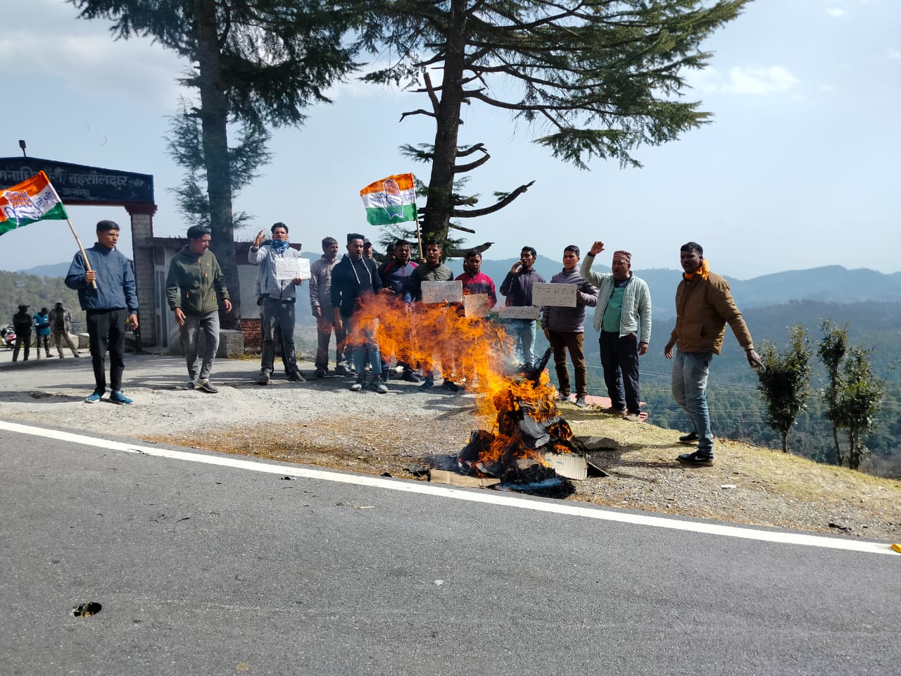 जागेश्वर-जागेश्वर विधानसभा की तहसील गरुडाबाज में 9 फरवरी 2023 को युवाओं पर भाजपा सरकार में पुलिस द्वारा लाठीचार्ज करने के विरोध में युवा कांग्रेस द्वारा मुख्यमंत्री,भाजपा सरकार तथा पुलिस प्रशासन का पुतला दहन कर विरोध दर्ज किया गया।इस अवसर पर कांग्रेस के युवा नेता गोपाल भट्ट ने कहा कि देहरादून में बेरोजगारों पर भाजपा सरकार द्वारा पुलिस के जरिए लाठी चार्ज करवाना बहुत ही दुर्भाग्यपूर्ण है।जिस प्रकार आज लगातार एक के बाद एक प्रतियोगी परीक्षाओं में भ्रष्टाचार सामने आ रहा है उसको लेकर छात्र सीबीआई जांच की मांग कर रहे हैं जो कि उचित भी है। इस अवसर पर युवा नेता गोपाल भट्ट ने कहा कि सरकार ही पेपर बना रही है, सरकार ही पेपर करवा रही है।सरकार में ही पेपर लीक ह रहे हैं।ये किस प्रकार का शासन भाजपा चला रही है हमारी समझ से बाहर हैं।आज युवा गांव,शहरों से देहरादून पहुंचा हैं और आक्रोशित है। युवाओं के साथ अन्याय हुआ है।उसके बाद भी सरकार सुनने के बजाय आरोपियों,भ्रष्टाचारियों को संरक्षण देने का काम कर रही है और आवाज उठाने वाले युवाओं पर लाठीचार्ज कर मुकदमे दर्ज कर रही है जिसका हम कड़े शब्दों में विरोध करते हैं और हम युवाओं के साथ हैं। उन्होंने कहा कि लाठीचार्ज के बाद कई साथी गिरफ्तार भी हुए हैं और लगातार आवाज उठा रहे हैं।विधानसभा अध्यक्ष युवा कांग्रेस वीरेंद्र सिंह मलारा ने कहा कि वे अपील करते हैं विभिन्न छात्र संगठनों से,युवा साथियों से कि सबको एकजुट होकर सड़कों में आने की आवश्यकता है। इस गूंगी बहरी सरकार के खिलाफ आवाज को बुलंद करने की जरूरत है।उत्तराखंड के युवाओ की मांग है कि उक्त प्रकरण की सीबीआई जांच हो। कार्यक्रम में वीरेंद्र सिंह मलारा विधानसभा अध्यक्ष युवा कांग्रेस जागेश्वर,दिनेश चंद्र जोशी, विशन सिंह बिष्ट,ब्लॉक अध्यक्ष कांग्रेस कमेटी जागेश्वर विजय कुमार टम्टा,गोपाल सिंह,रोशन लाल टम्टा पूर्व छात्रसंघ अध्यक्ष,कमल किशोर,पवन टम्टा,प्रकाश आर्य,भीम राम,विशन राम,बसंत चम्याल, राजेंद्र सिंह नेगी,हरीश राम,प्रमोद आगरी सहित दर्जनों युवा उपस्थित रहे।