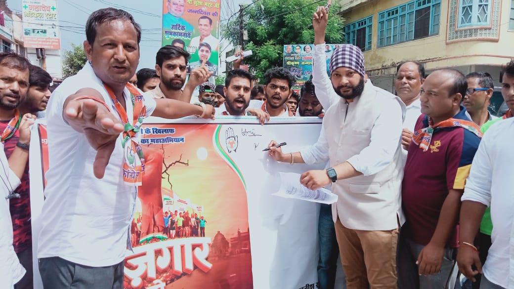 चम्पावत-आज करन सिंह एवं अनीस सिंह राणा युवा कांग्रेस जिला प्रभारी चंपावत द्वारा अपने प्रभार क्षेत्र जिला चंपावत के नगर टनकपुर में कांग्रेस कार्यालय में बैठक आहूत की गई। उसके तत्पश्चात युवा कांग्रेस के पदाधिकारी एवं कार्यकर्ताओं द्वारा रोजगार दो,युवाओं को न्याय दो कार्यक्रम के तहत टनकपुर शहर में बेरोजगारी के खिलाफ हल्लाबोल कार्यक्रम आयोजित किया गया।जिसके तहत टनकपुर तिराहे में बेरोजगारी के खिलाफ युवाओं द्वारा पोस्टर (बैनर)हस्ताक्षर अभियान एवं वाल पेंटिंग करवा के शुरू किया गया ।जिसमें दर्जनों युवाओं ने हस्ताक्षर कर सरकार के खिलाफ हल्लाबोला।